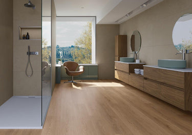 - Het voordeel: Je kunt de luxe uitstraling van een houtlook vloer nu ook doortrekken naar de badkamer, de keuken of het toilet.