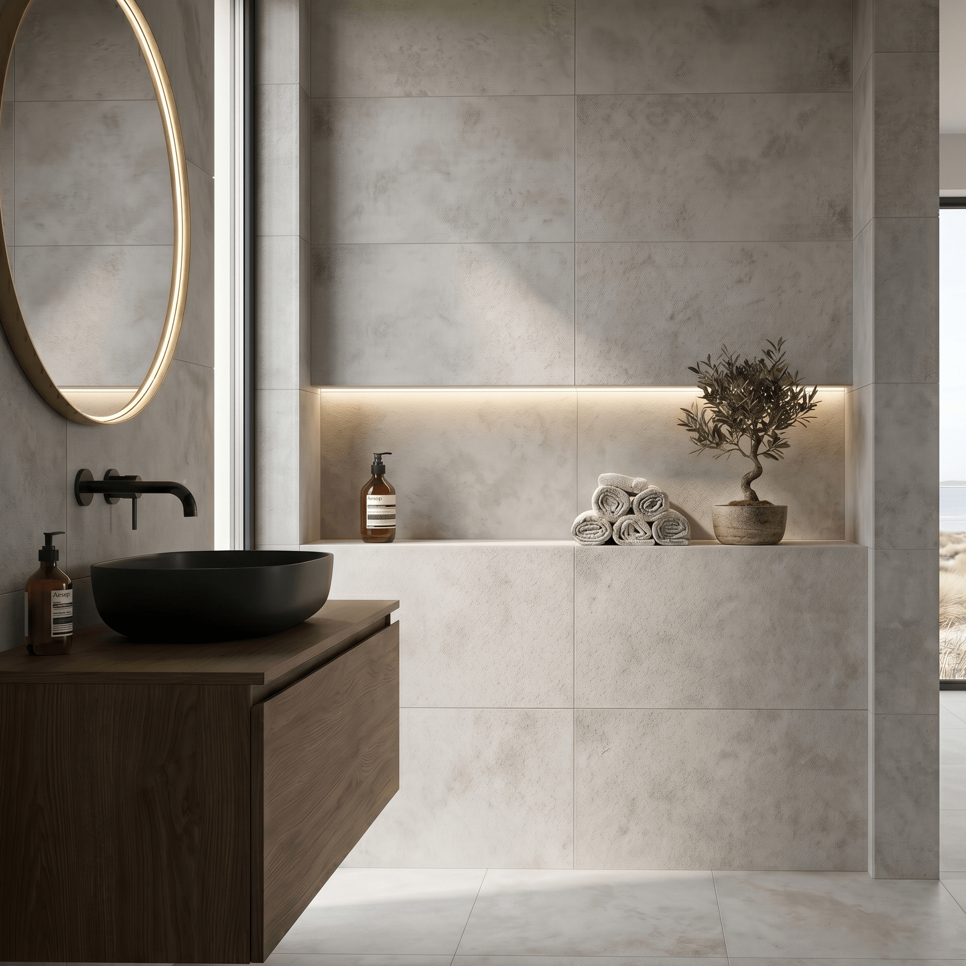 Toepassing: Vloer- én wandtegel (De perfecte oplossing om een naadloze betonlook te creëren die veilig van de badkamervloer doorloopt tot diep in de douche, of om de wanden een strakke, industriële textuur te geven).