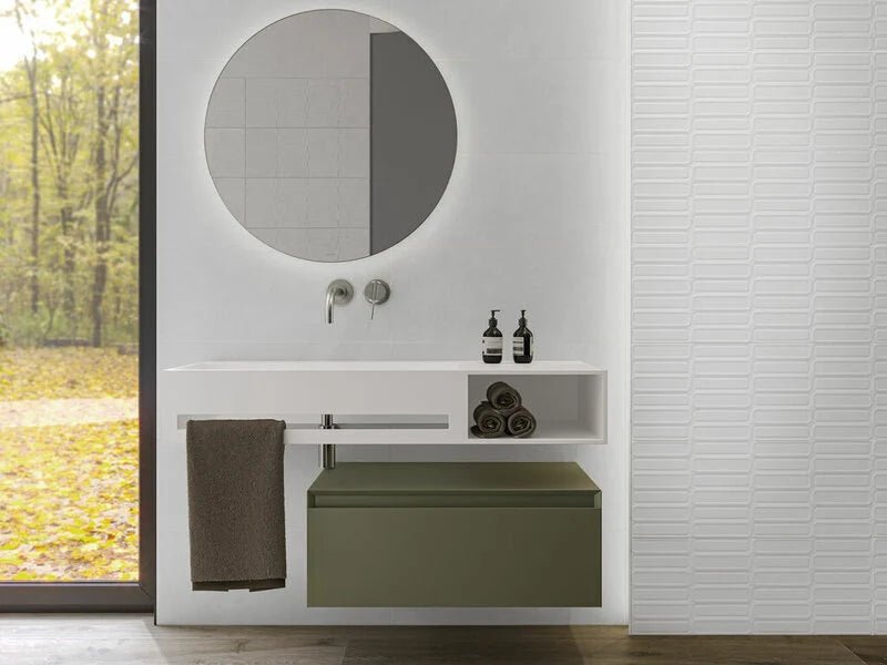 De Cifre Alure White Oval Decor 30x75 cm is een elegante wandtegel met subtiel reliëf in een ovale structuur. Deze decoratieve tegel combineert een zachte lichtgrijze betonlook met een verfijnd reliëfpatroon, wat zorgt voor diepte en een unieke uitstraling aan je wand.