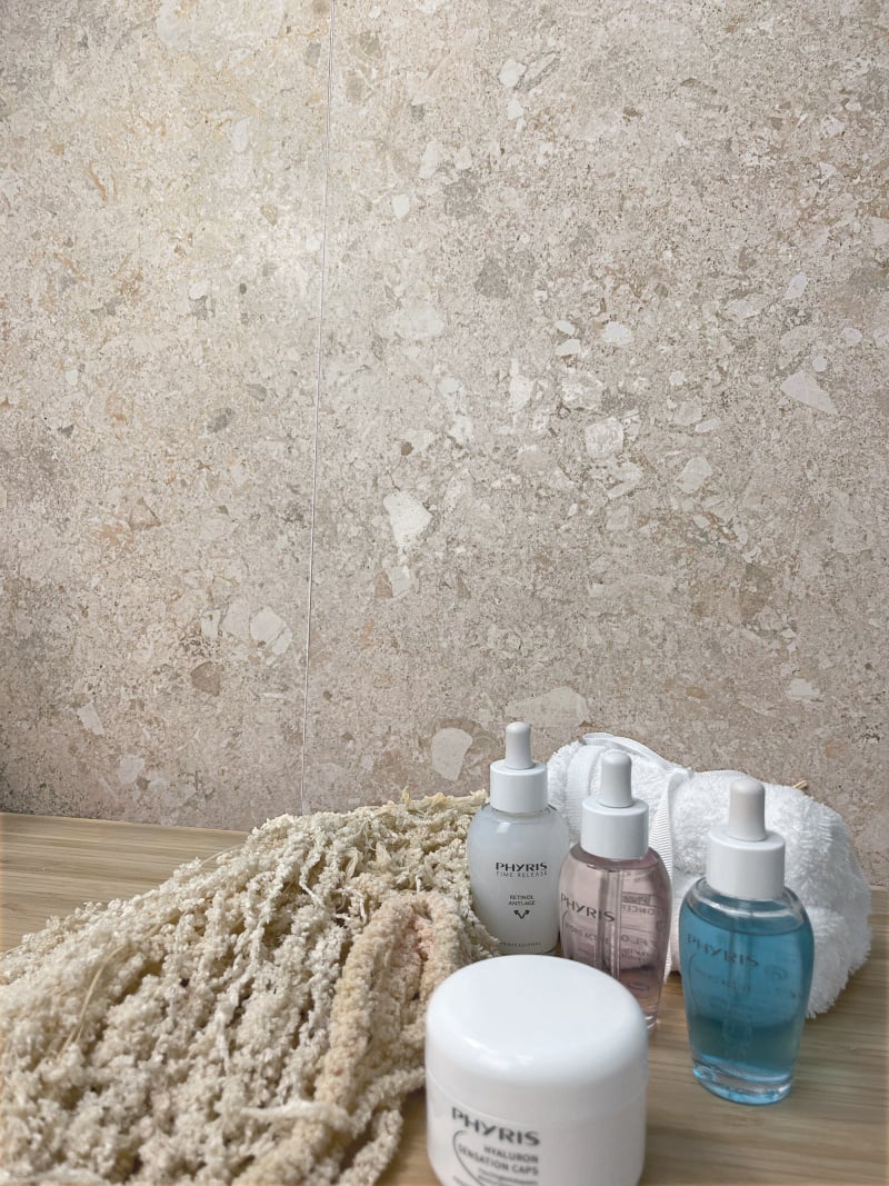 • Afwerking: mat – terrazzo-dessin in zachte beige tint met fijne steensnippers