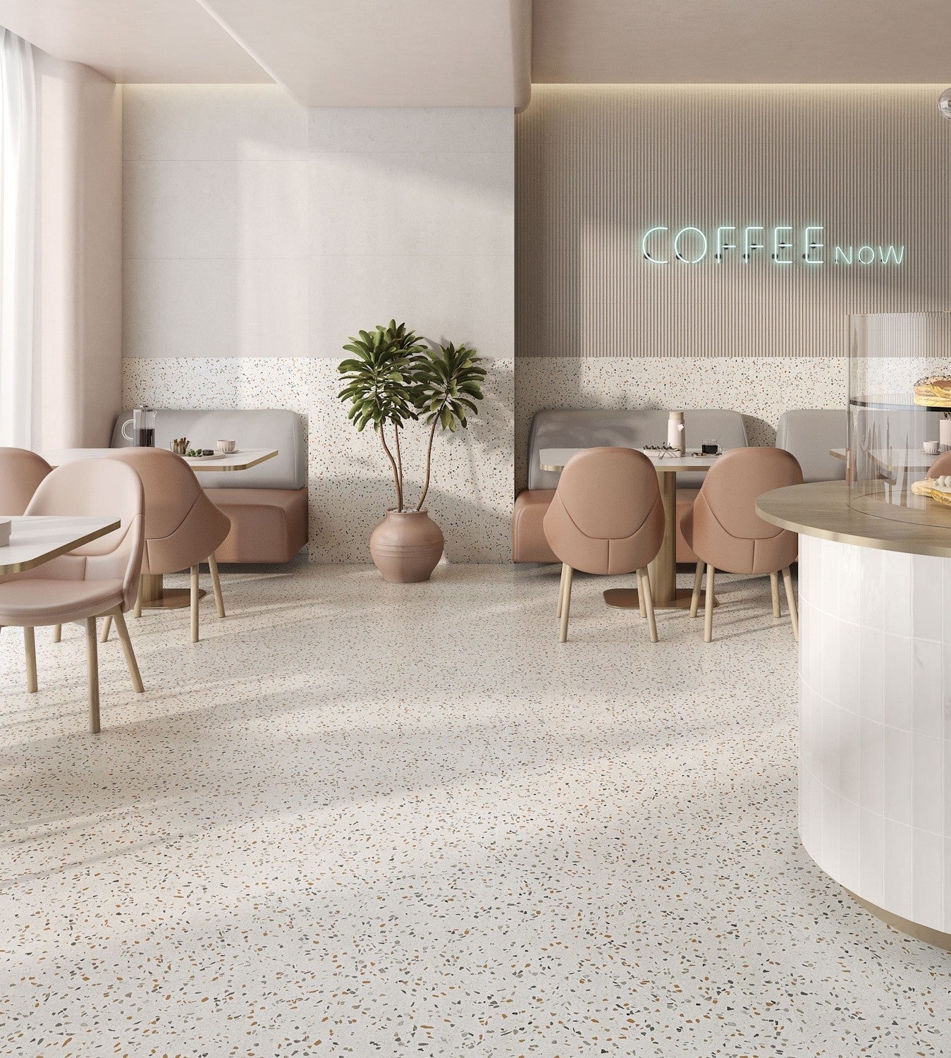Stijl: terrazzo look – klassieke terrazzo-uitstraling gecombineerd met moderne kleurtonen voor een eigentijdse sfeer