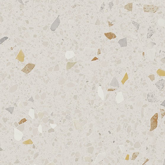 Look: Terrazzo (Een modern eerbetoon aan de traditionele Italiaanse korrelvloer, uitgevoerd in een verfijnde "Pixstone" variant die rustiger oogt dan klassiek terrazzo).