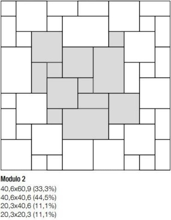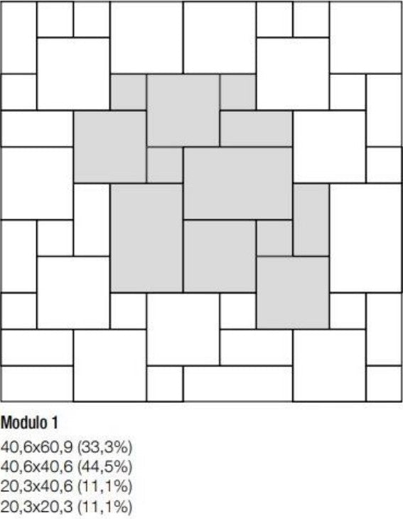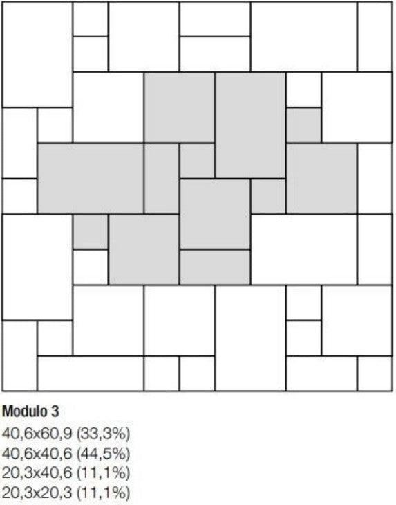 Inhoud per doos: 0,76 m² (Samenstelling: 2x 20,3x20,3 cm, 2x 40,6x40,6 cm, 1x 20,3x40,6 cm, 1x 40,6x60,9 cm)