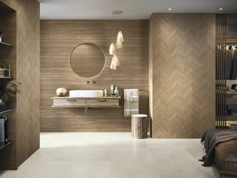 Een elegante houtlook wandtegel die natuurlijke warmte en moderne klasse samenbrengt. Ideaal voor wie design en comfort moeiteloos wil combineren.