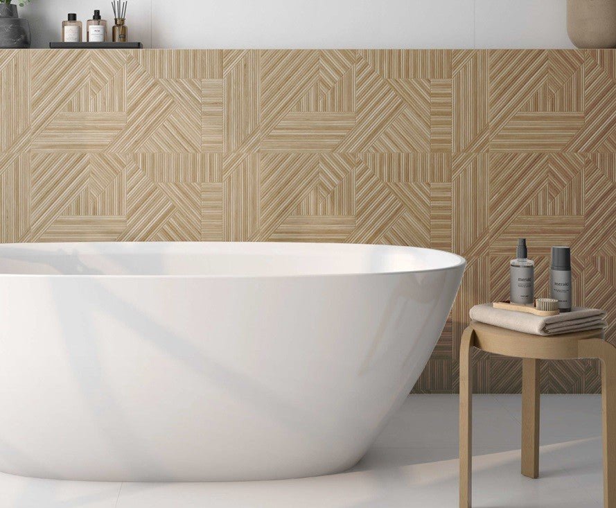 Deze tegel is ideaal voor wie de warme charme van hout wil combineren met het gebruiksgemak van keramiek. Dankzij het royale formaat en de decoratieve structuur ontstaat een stijlvolle wand die zorgt voor een sfeervolle en natuurlijke uitstraling.
